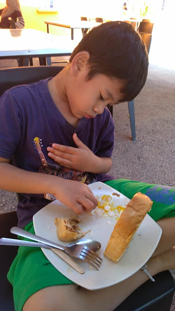 | Disebabkan Hannan puasa dari jam 12 malam, sekarang jam 5.30 petang baru jumpa makanan. Bagi makanan lembut, roti goyang. Alhamdulillah habis sekeping roti. |